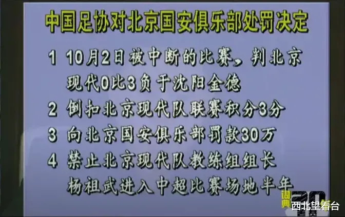 5分钟后,面对无法恢复的比赛,周伟新重新把哨子放在嘴边,吹响了两短一长的结束音。这声哨响,也随着当时已经普及开来的互联网传遍了全国:“国安罢赛!”两天后,余怒未消的国安领队杨祖武召开了媒体发布会,通过媒体的镜头再次表达了国安俱乐部的态度:“若足协处罚不公,我们就退出中超联赛!”这边厢是愤怒的国安,那边厢——国安矛头直指的中国足协却显得非常平静。足协新闻官董华在接受记者采访时表示:“适时会给大家一个交代。”而这个所谓的“交代”,由时任足协纪律委员会副主任马成全宣布:“对北京国安足球俱乐部罚款人民币30万元;判本场比赛北京现代队0:3负;扣除北京现代队2004年中超联赛积分3分。”